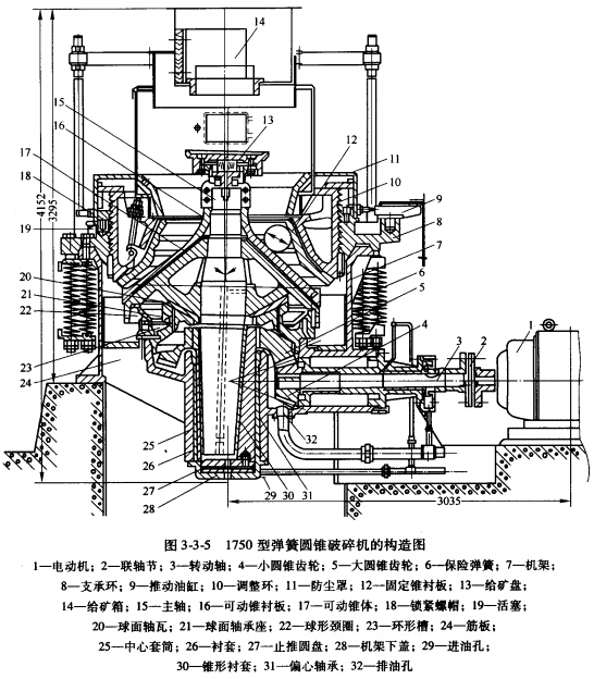 图3-3-5为1750型弹簧圆锥破碎机的构造图。它与旋回破碎机的构造大体相似,但有区别,现简介如下。